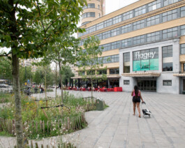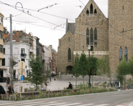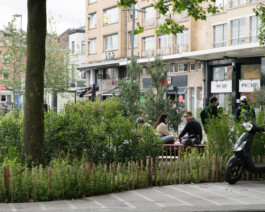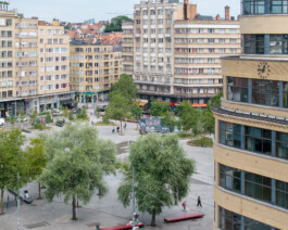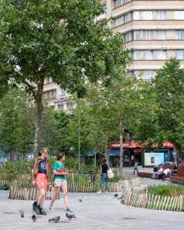 In Brussels, Place Flagey and Sainte-Croix are being reimagined with a new layer of greenery. The design builds on the square’s existing rhythm, adding over 2,000 m² of planted space and around 60 new trees. These green areas act as rain gardens, buffering water and softening the urban heat.