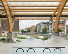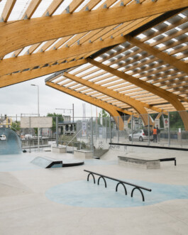 For the new Recypark in Anderlecht, a covered skatepark and public space were created along the Charleroi Canal — a place where reuse, water, and urban movement come together. The design draws on the origins of skate culture, which grew from repurposing empty pools and concrete structures, and extends this spirit through the use of reclaimed materials and flowing, water‑inspired forms.