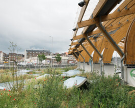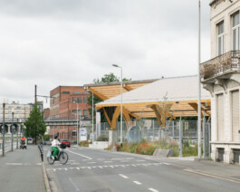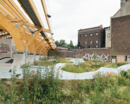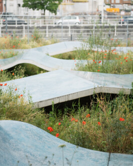 The skatepark sits within the wider landscape of the Senne valley, echoing the traces of water that shaped Brussels. Its curves and lines follow the logic of a “snake run,” guiding skaters through a sequence of open and sheltered spaces. Around it, planted areas manage rainwater and create pockets of biodiversity, softening the industrial setting.